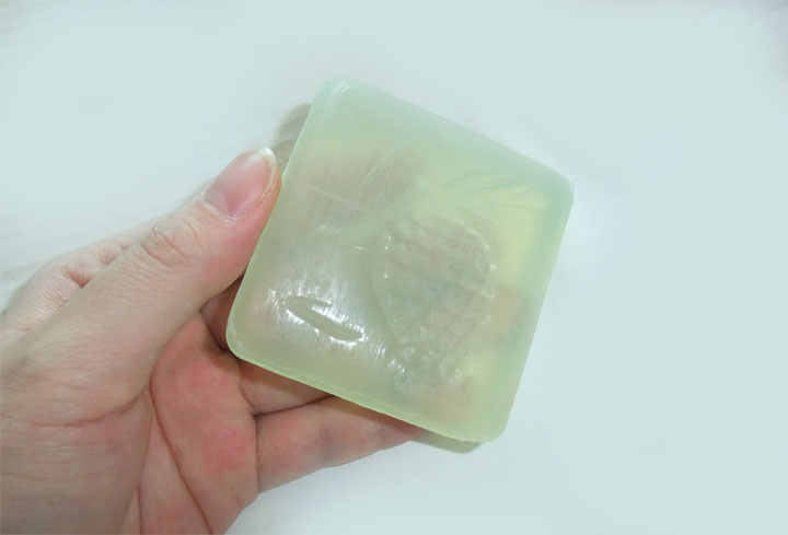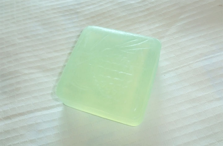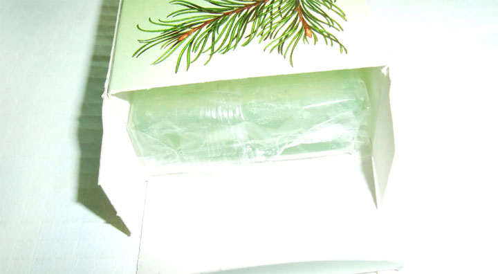 제품을 뜯어봅니다. 소나무 색감이 살짝 들어간 약간은 불투명한 색감의 비누가 보입니다.