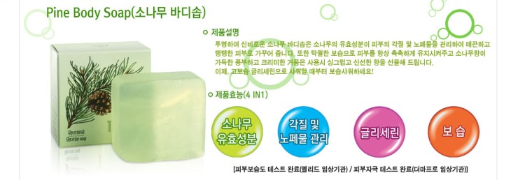 사용 후의 느낌은 뽀드득한 마무리감으로 개운함을 줍니다. 글리세린과 소나무성분으로 피부의 각질 및 노폐물을 제거하고, 탁월한 보습력으로 촉촉한 피부로 만드는데에 도움을 줍니다. |