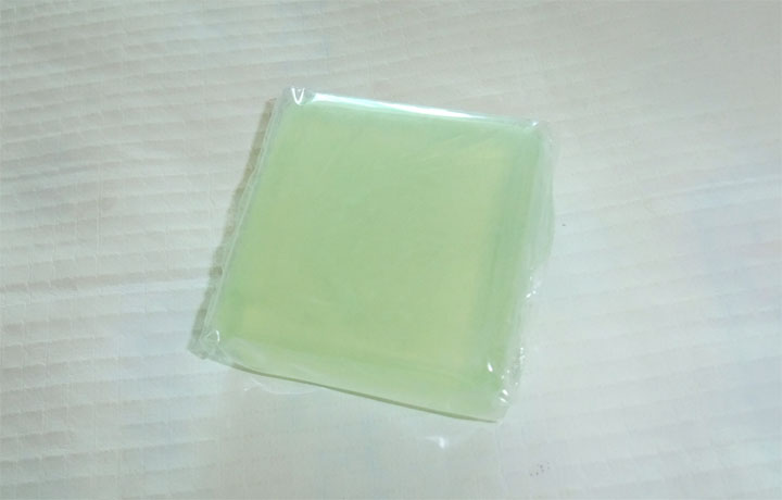 보시는 것처럼 비닐로 한겹 씌워져 있구요.. 색깔은 연두빛이 들어간 색깔이예요.. 탁한 투명한 비누정도?