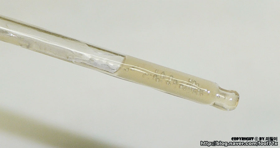 앰플은 다 이런 용기이죠~ 그리고 안의 내용물을 보니 약간 노란빛을 띄는 제품이었습니다.