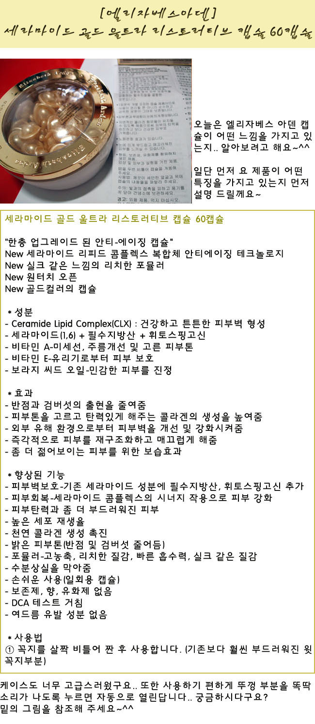 <span class="pcol1 itemSubjectBoldfont">[엘리자베스아덴] 세라마이드 골드 울트라 리스토러티브 캡슐 60캡슐</span> 연예/화보 조회 0 원본보기 0 인기도 점수 0 0 요약 세라마이드 골드 울트라 리스트러티브 브랜드 엘리자베스아덴 엘리자베스아덴 60캡슐, 피부보호, 세포활성화, 탄력 평점 제품 다 사용후의 피부 변화에 따른 자세한 리뷰는 추후 또 올리도록 할께요~^^ (제품 내용 출처: http://www.elizabetharden.co.kr/ ) 원본 페이지로 이동 추천 콘텐츠 배민의 반격 0 대륙 주간만화의 패기 0 디톡스치료くヲ 추천 0 클라라삘 야구 관중 ㅊㅈ 0 재경이의 음란한 못된손.gif 0 대형마트 근황 0 관련 이미지 100 수치녀 근황 516 흔한 BJ처자들 374 시스루.jpg 86 뒤태쩌는 최혜연.jpg 133 어후 시노자키 아이 좋네요 ㄷㄷ 112 시노자키 아이 82 유이 수영복에 선명한 자국 131