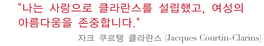 사랑하는 마음은 창조하는 마음입니다. 클라란스는 고객 개개인의 욕구와 니즈를 충족시키는 제품을 만들기 위해 노력합니다. 우리는 고객 한 분 한 분이 특별하다는 것을 알고 있으며, 이들 각각의 소리에 귀 기울이고 있습니다. 사랑은 돈에 좌우되지 않는 법이며, 클라란스 연구소는 단 한가지 지침에 따라 운영됩니다. 바로 '최고의 제품을 선보인다'는 것입니다. 사랑한다는 것은 항상 옆에서 동반자, 안내자, 조언자의 역할을 한다는 것을 의미합니다. 또한 사랑은 세상이 더 나은 곳이 되도록 꿈꾸는 것이며, 그렇기 때문에 우리는 희귀하고 효과적인 성분을 제공해 주는 자연을 보호하는 것입니다. 삶이 더욱 아름다운 이유, 클라란스 ...