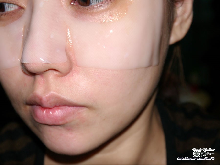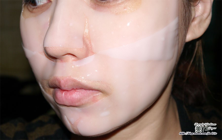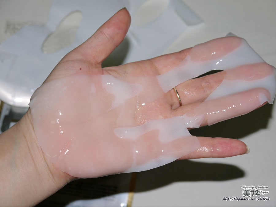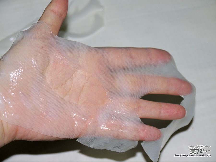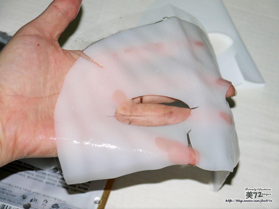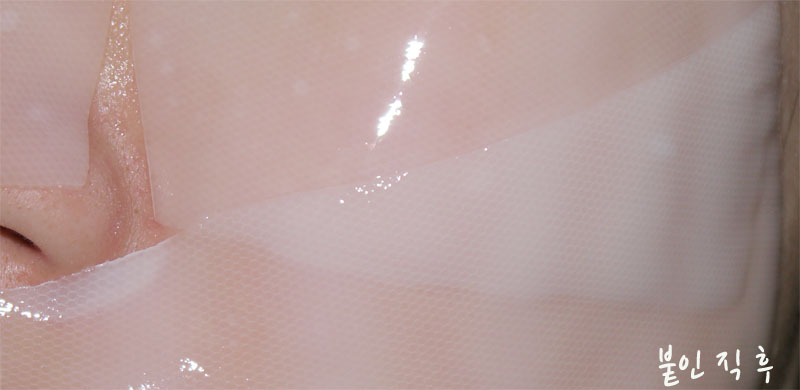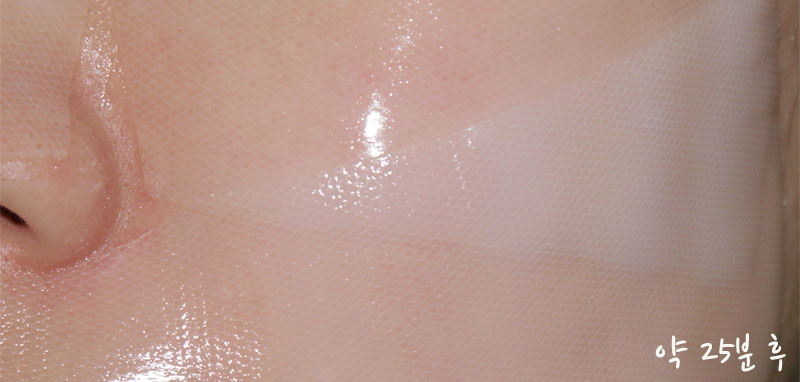 금방 붙였을때엔 백색을 띄던 마스크팩이 25분정도 지난 후에는 피부색깔이 거의 비춰질정도로 투명해진 모습!!!