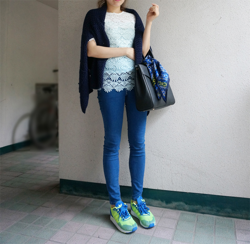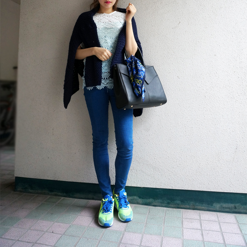 블루와 라임이 포인트로 들어간 스카프로 포인트를 해줬어요~