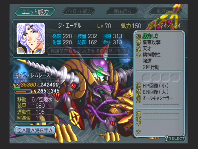 근데 이제와서 하는 말이지만 로봇들의 개조와 파일럿 육성을 한쪽으로 치우치게 했다면 마지막 전투가 매우 곤욕스러웠을 겁니다. '카오스 레무레스' 는 마지막 보스답게 [HP : 242,400 / 갑옷 : 1,980] 이나 되고 [올 캔슬러 + HP회복 小] 까지 가지고 있어서 등장한 다음턴에 끝을 보는게 편합니다. 게다가 적 턴에서 '카오스 레무레스' 는 2회 이동을 하는데 근처에 아군 유닛이 없으면 약한 유닛을 연달아 두번 공격하는데 상태이상을 동반해서 괴롭히고, 근처에 아군 유닛이 많으면 넬아가마의 맵병기를 사방으로 사용하는 듯한 맵병기를 사용하는데 이게 명중률이 꽤나 높아서 잘 맞습니다. 파괴력도 좋은 편이고요.