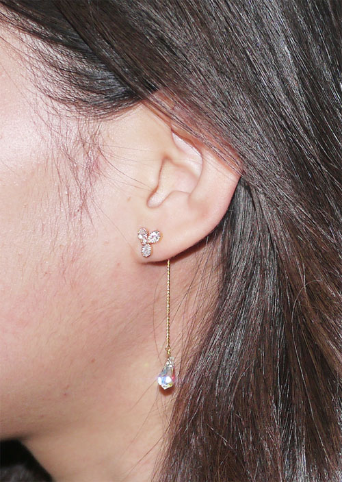 보시는 것처럼 길게 늘어지는 귀걸이가 침에 달려있는게 아닌 뒤에 꽂는 부분에 붙어있어요!