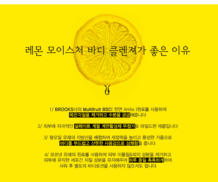 아무래도 바디클렌져는 향을 많이 보는데 향이 너무 상큼해서 요즘 사용하기 너무 좋았구요.. 게다가 레몬독소 제거 기능까지 있다고 하니까 사용감이 더 괜찮더라구요~ 요즘 레몬디톡스 많이들 하시잖아요!