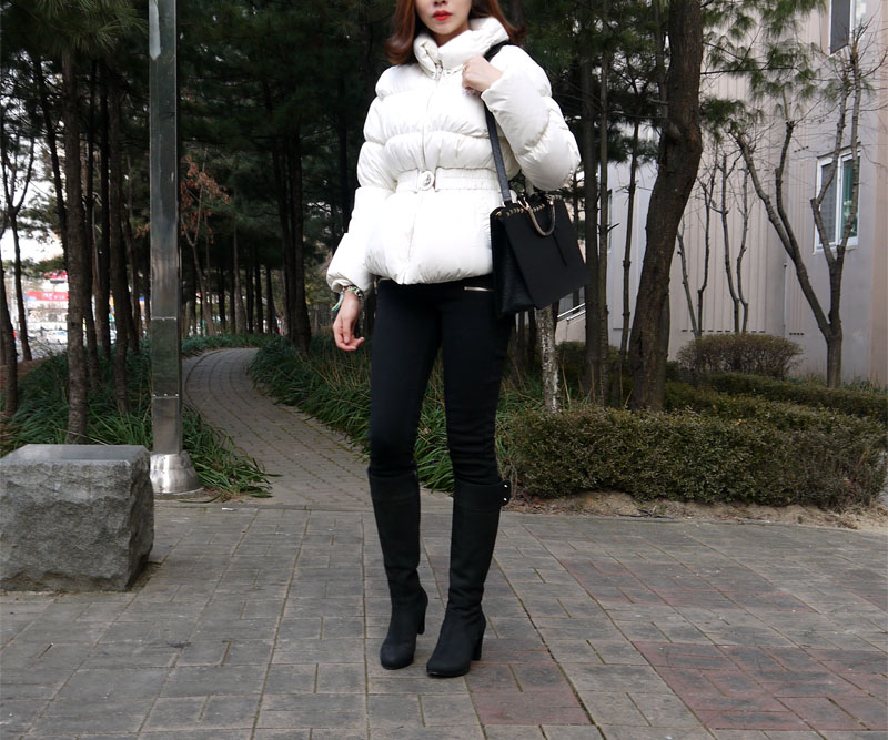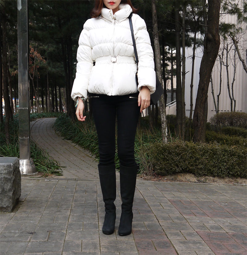 허리부분에 벨트가 따로 있어서 더 여성스럽게 입기 좋은 패딩과 함께한 데일리룩이예요~