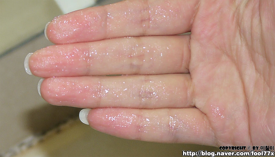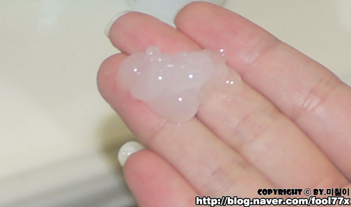 손에 덜어보니, 보시는것처럼 반투명한 약간 탁한 느낌으로 이루어진 젤타입으로 이루어져 있어요!