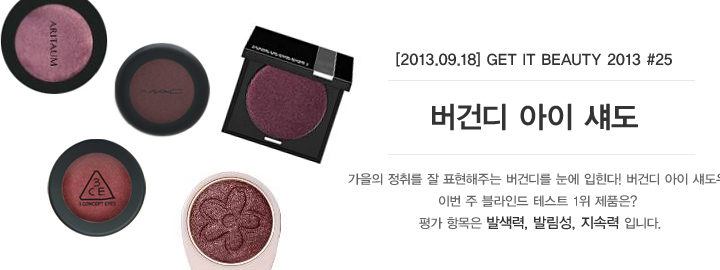 겟잇뷰티 버건디 아이섀도우 순위 평가 항목은 발색력, 발림성, 지속력을