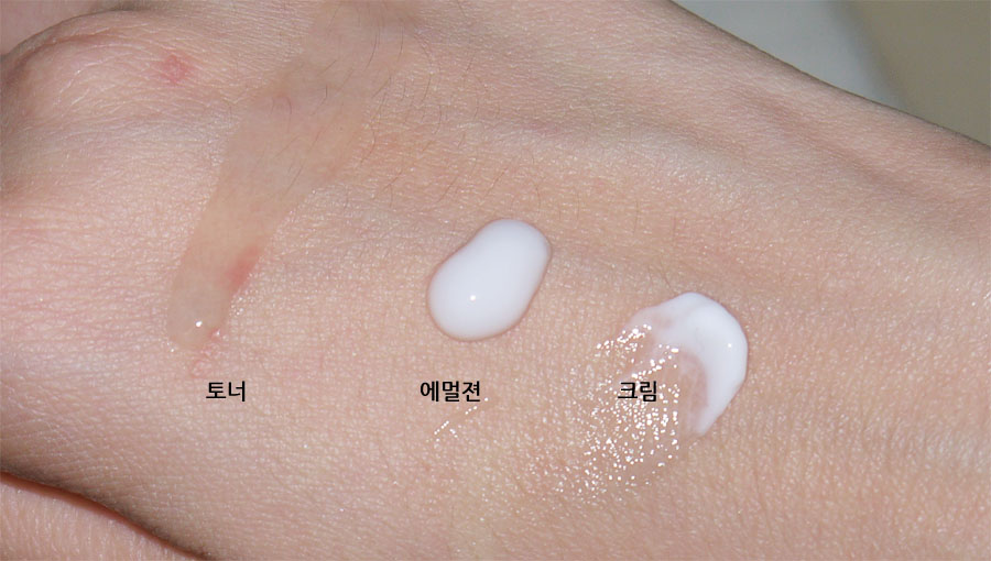 가장 위부터 차례대로 토너, 에멀젼, 크림의 제품을 손등에 테스트 해본 모습입니다.