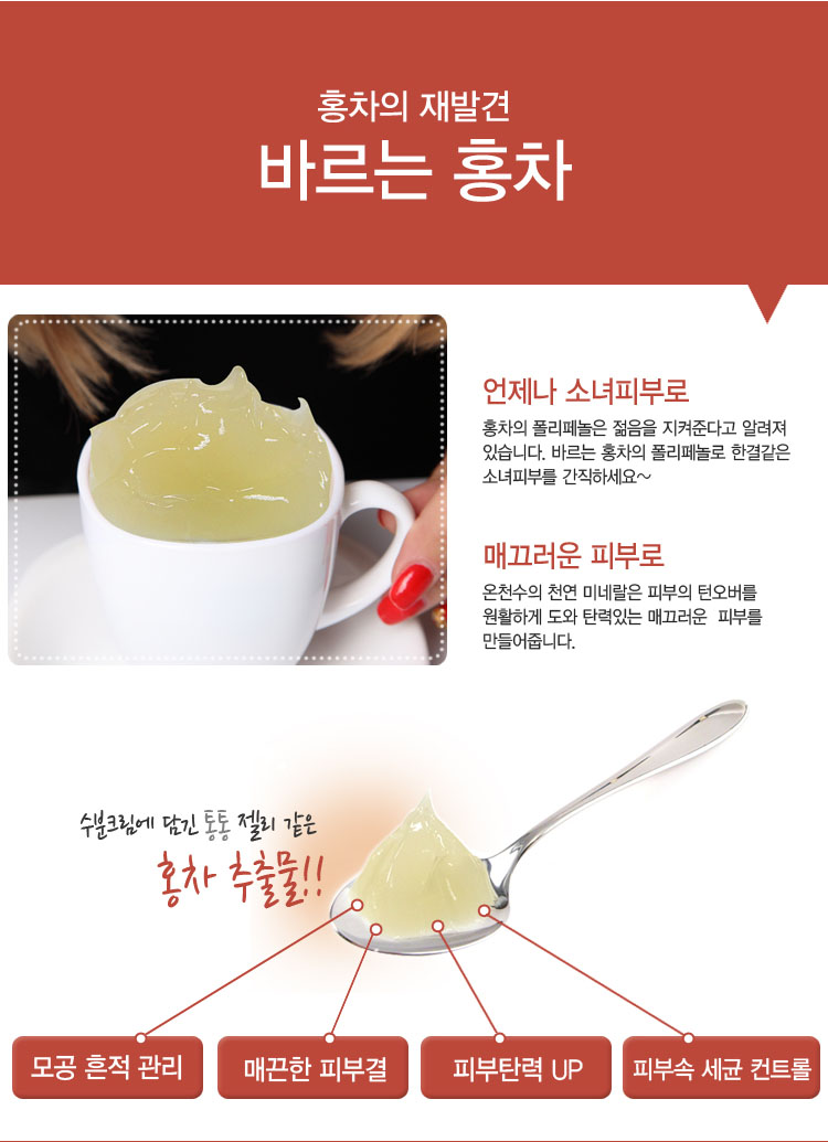 홍차추출물, 쌀 발효액, 온천수 등의 천연성분으로 피부 보습, 피지관리, 트러블, 쿨링 등의