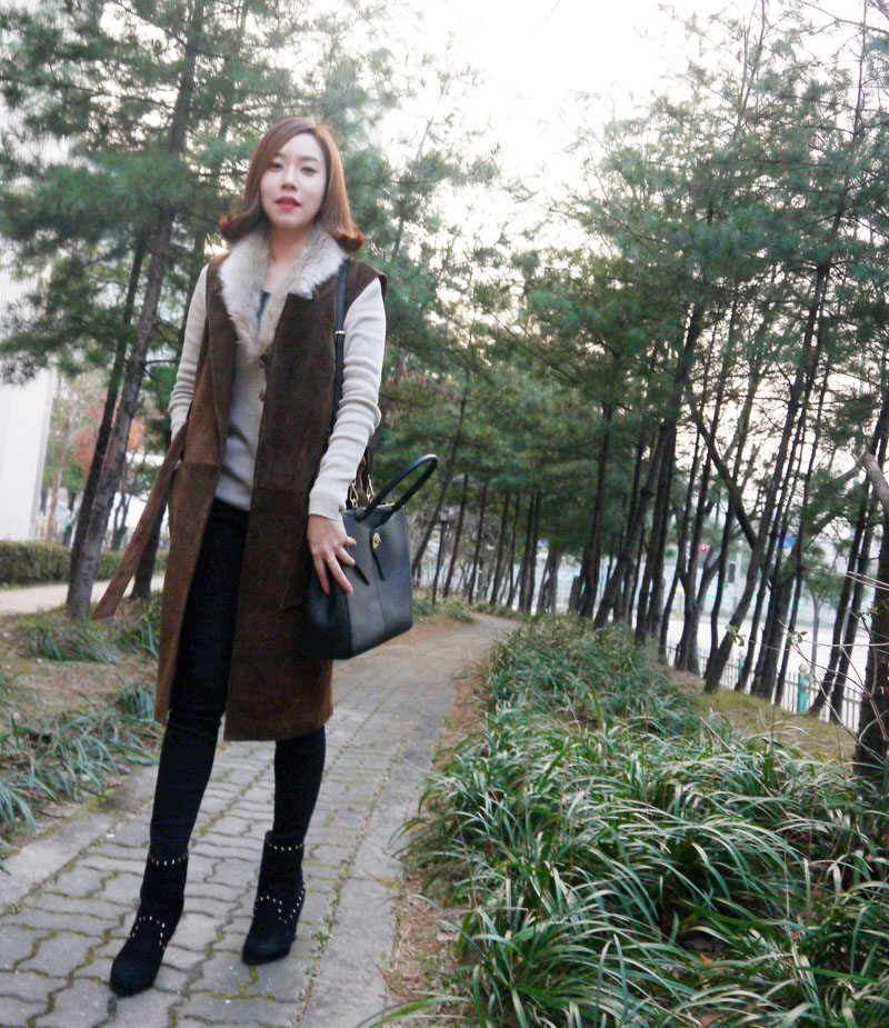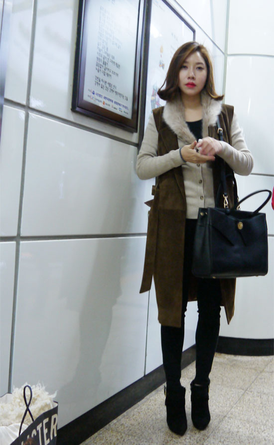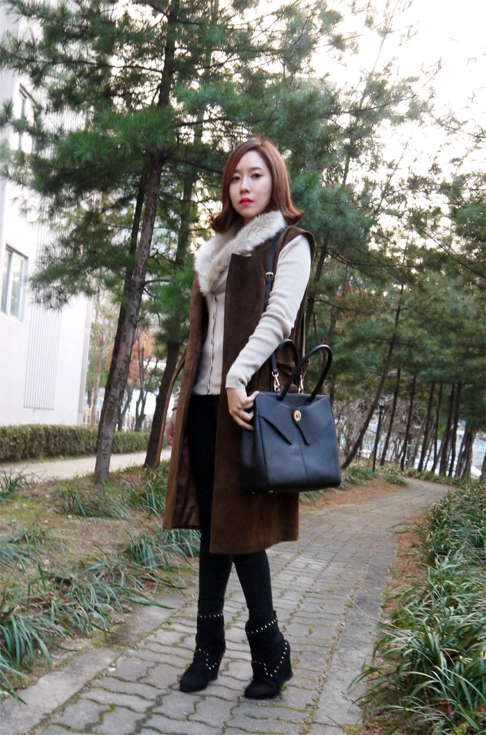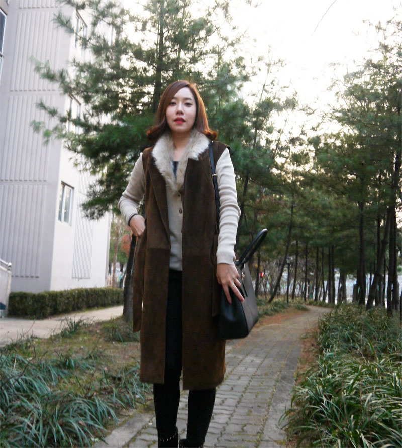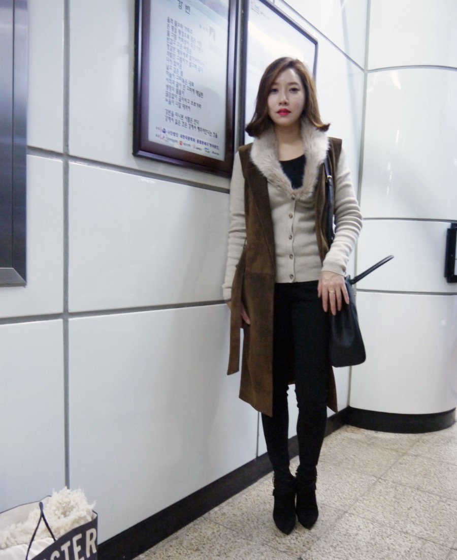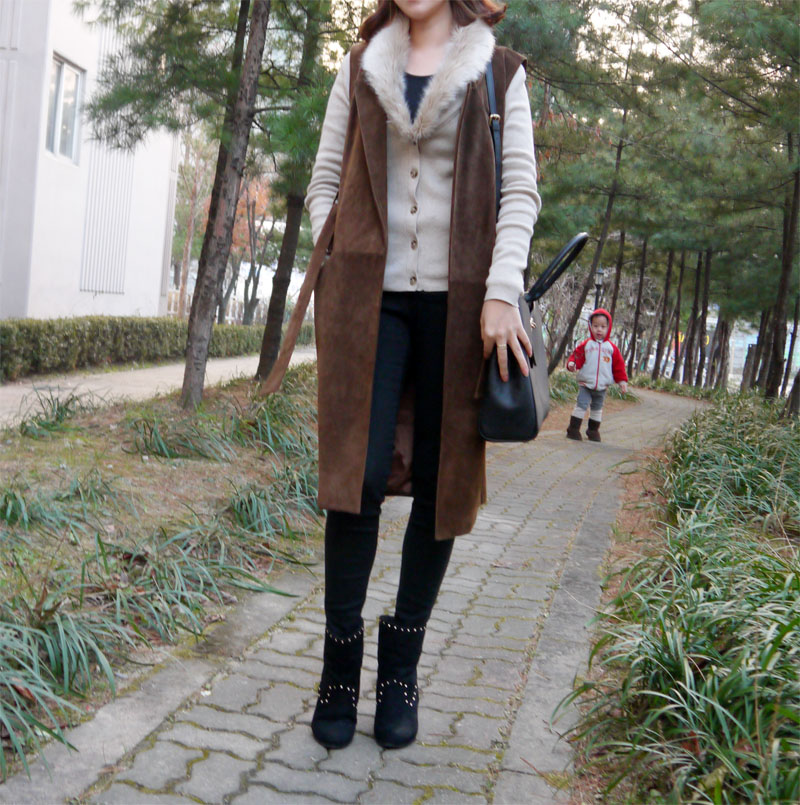 바나나리퍼블릭의 베이지 퍼가디건과 더룸의 가죽베스트와 함께 코디했습니다.^^