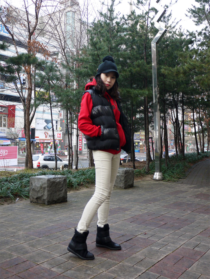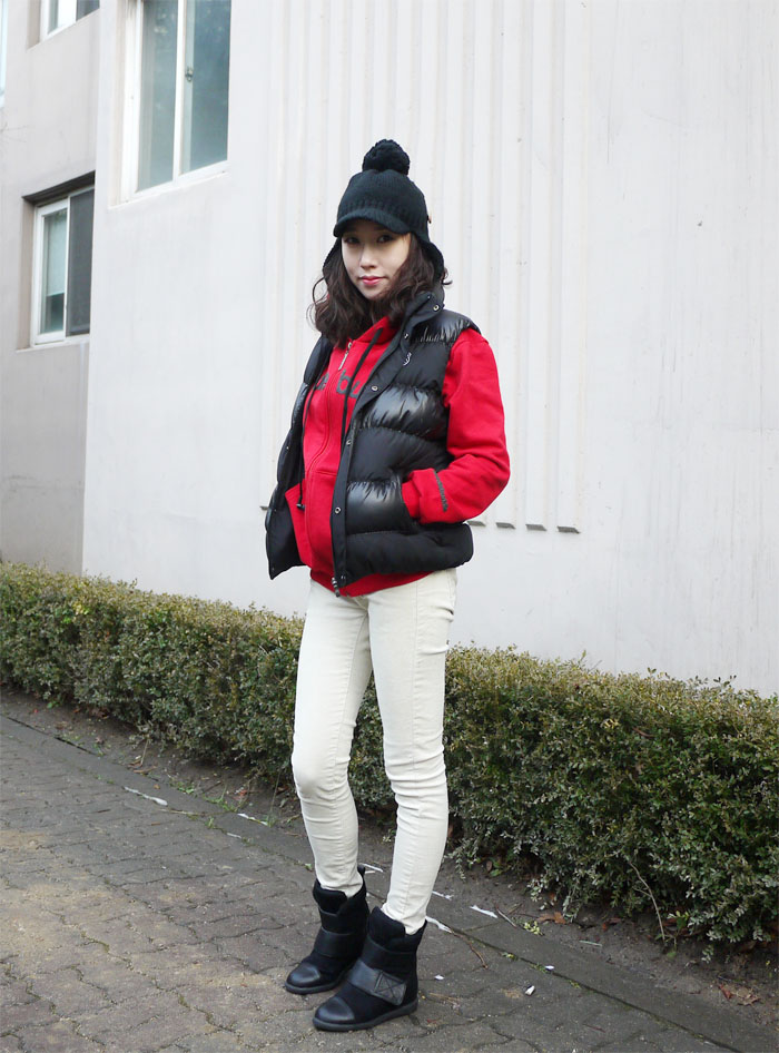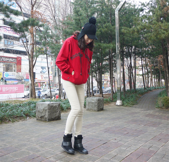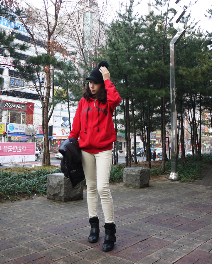 상의 후드는 레드로, 하의는 아이보리의 골덴팬츠로 코디를 해보았는데요..