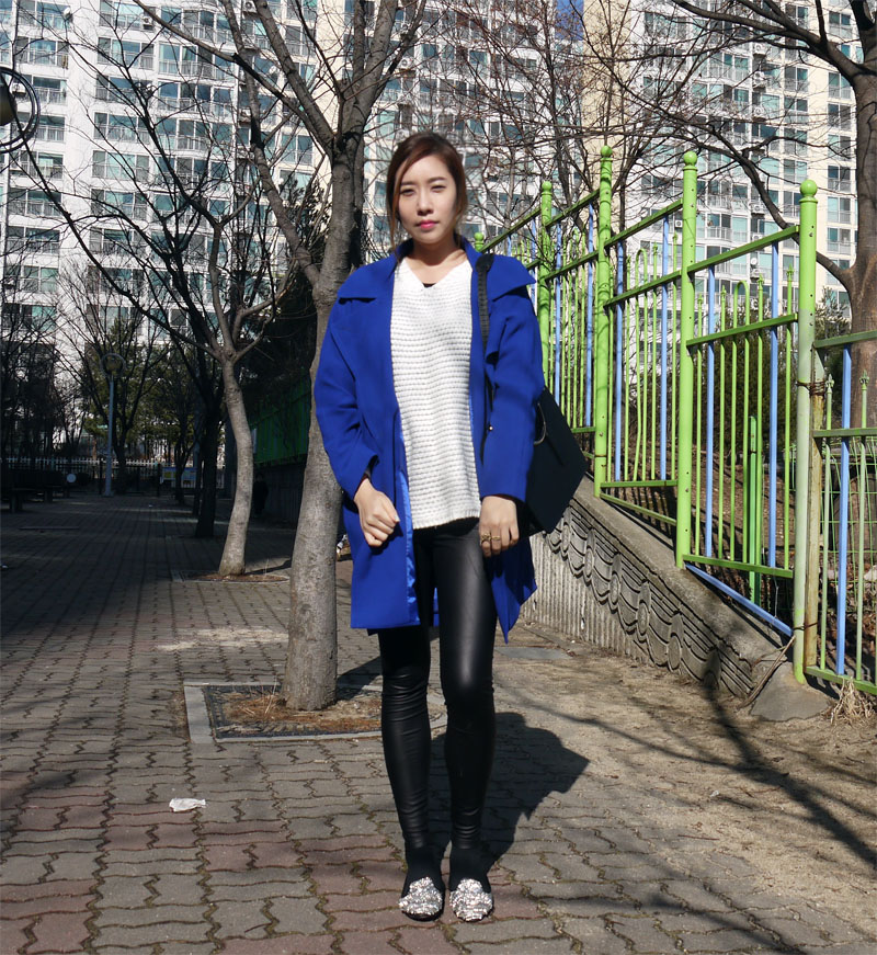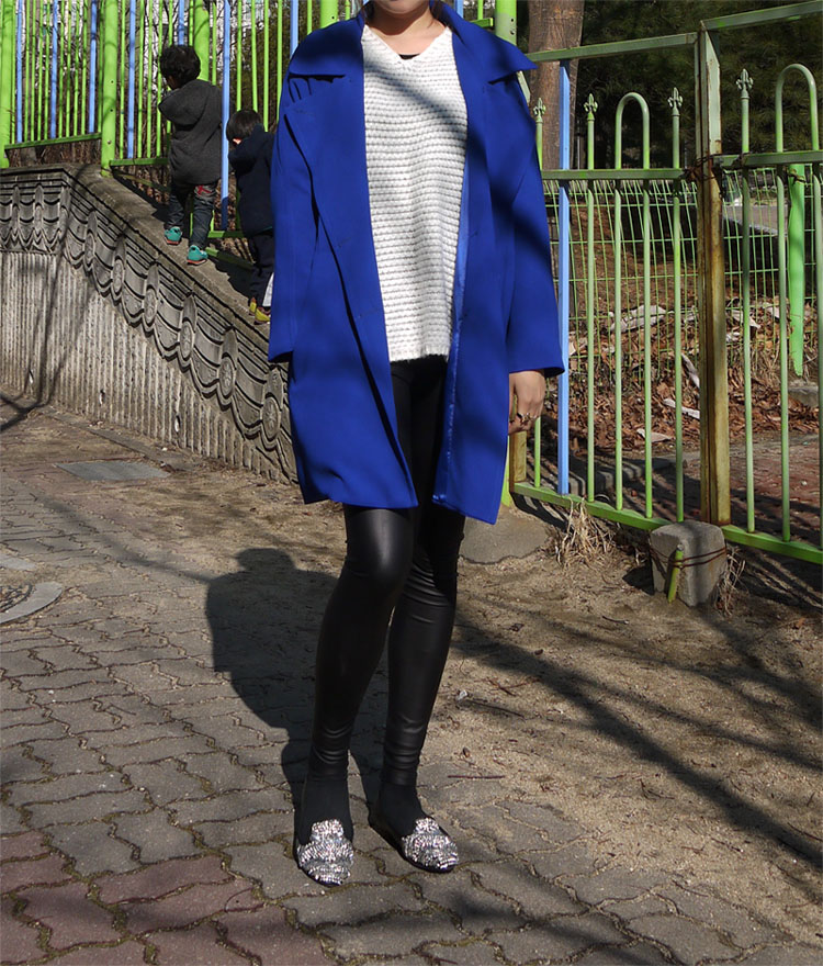 이상, 코발트블루 코트와 아이보리 니트, 무광가죽레깅스와 함께했던 코디였습니다.^^
