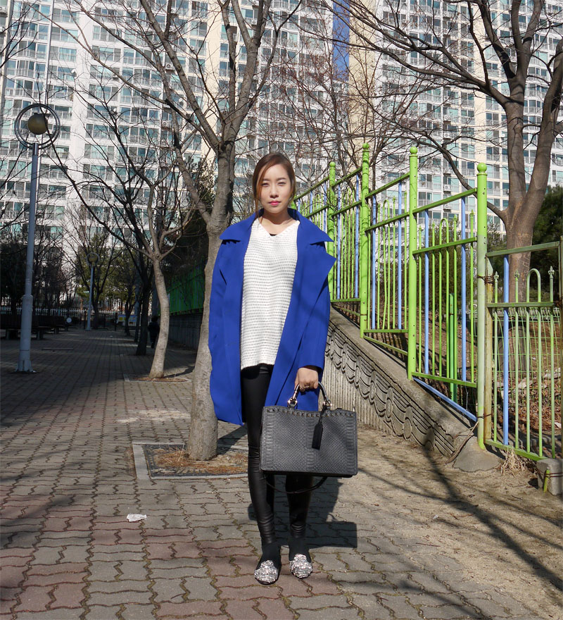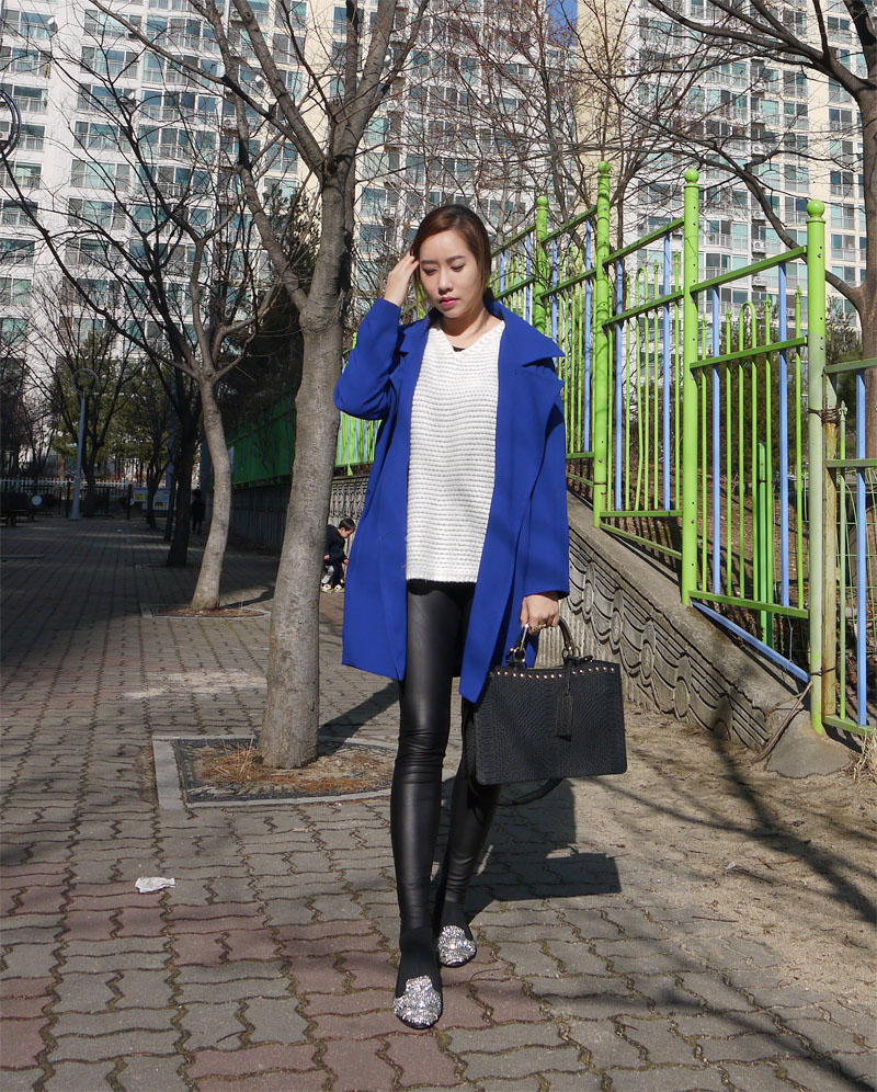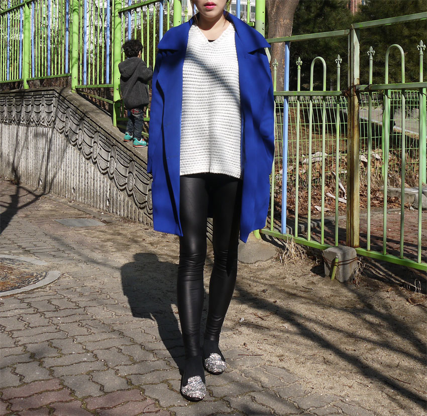 코발트블루 코트 코디, 아이보리 니트 , 무광가죽레깅스