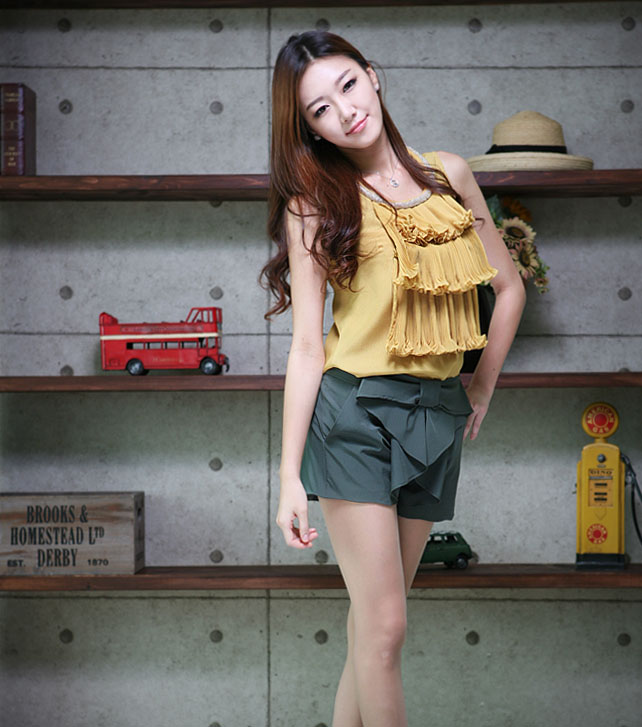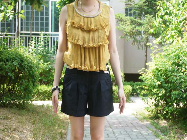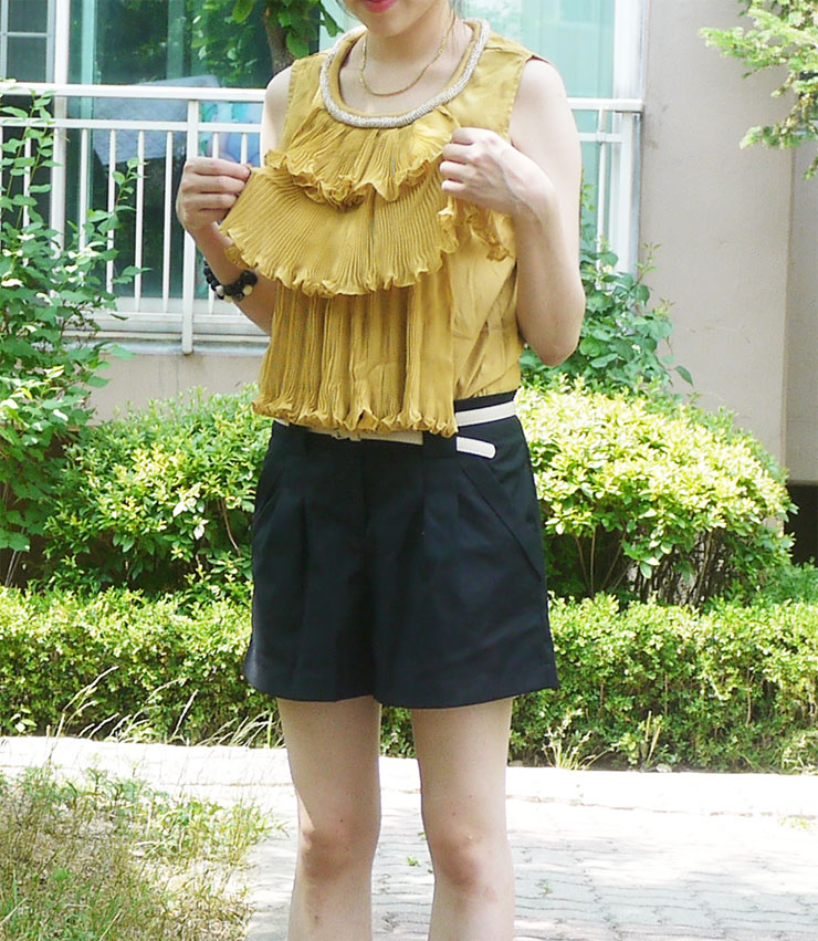 입었을때 앞모습입니다. 아코디언 주름이 이쁘지 않나요? 포인트 주기에 딱이랍니다.ㅋ