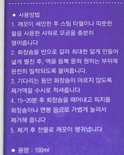 안마르도록 수시로 적셔주면서 15~20분 뒤에 떼어내고 피지제거후에 찬물로 헹궈내면 된다고 합니다.