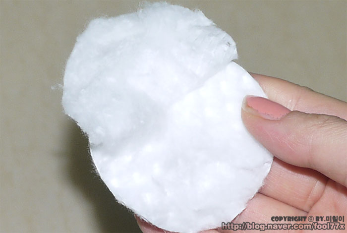 화장솜을 반으로 갈라.. 얇게 한뒤에... 제품을 적셔줍니다.