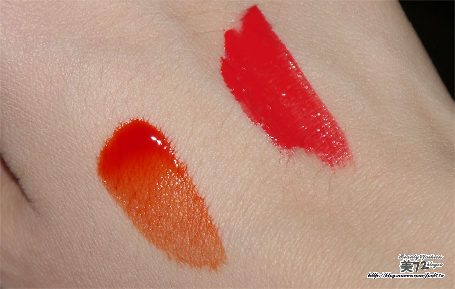 좌측이 토니틴트 오렌지차차 색상이며, 우측이 립마스터 레드 컬러의 발색 모습이예요~