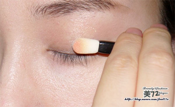 베이지 골드를 전체적으로 깔아주고, 오렌지로 포인트를 살짝 준다음에 브라운 컬러로 눈꼬리 부분부터 그라데이션