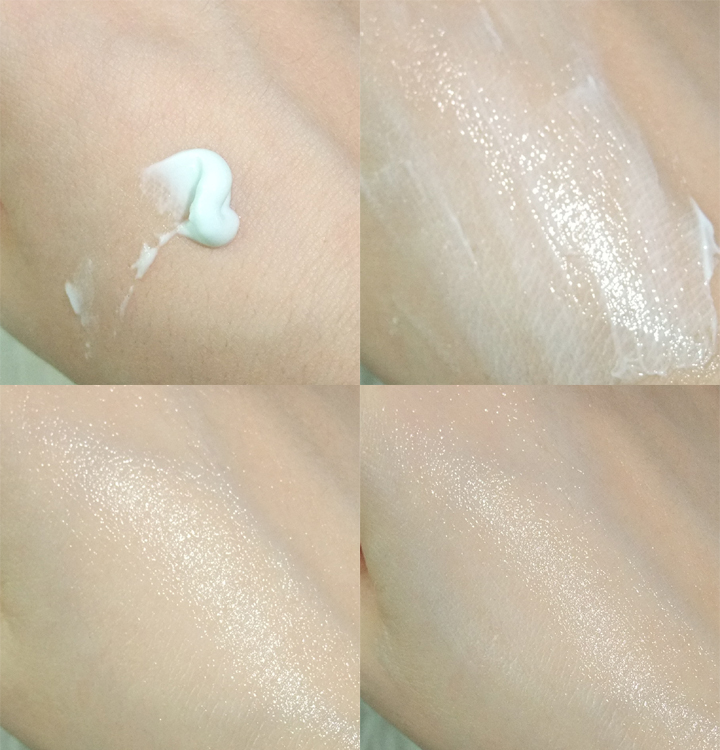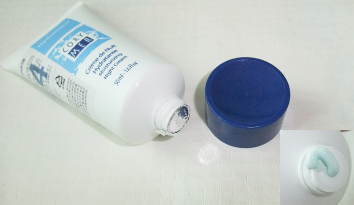 해양성 원료에 어울리는 하늘빛 색상의 제형으로, 끈적이거나 무겁지 않은 적당한 느낌의 나이트 크림 제형이었어요..