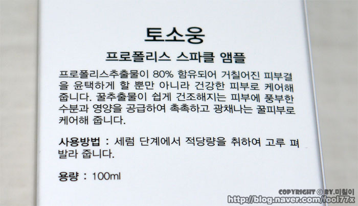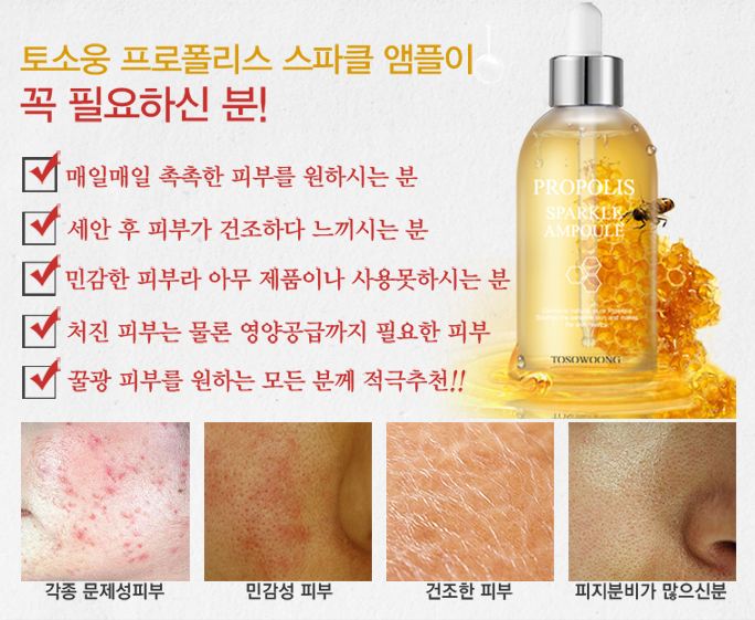 여러가지 피부타입에 다 잘 맞고요~ 보습 및 영양 케어에 좋은 토소웅 프로폴리스 앰플!