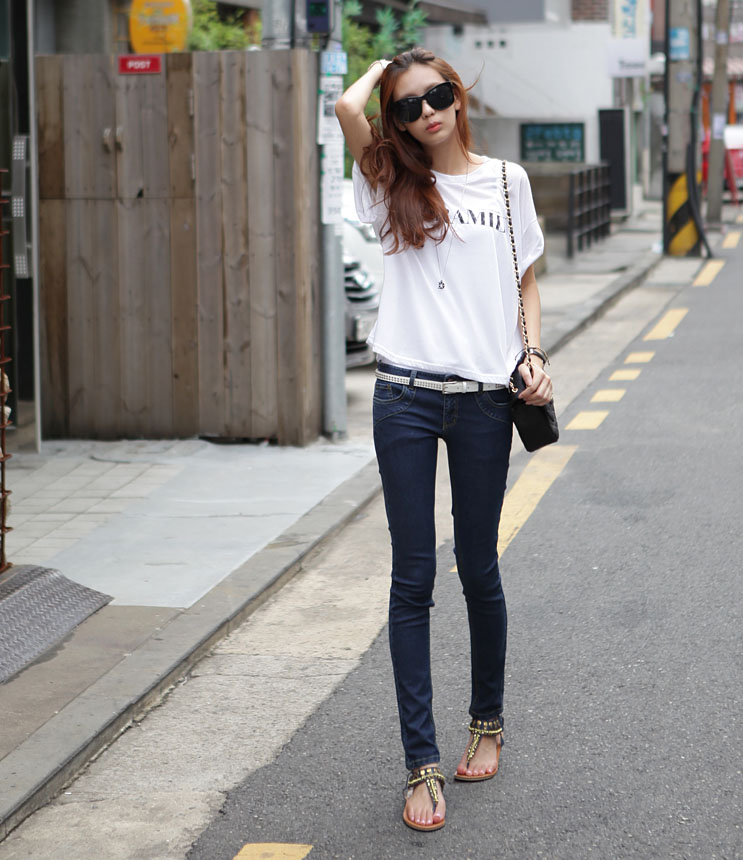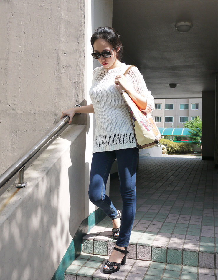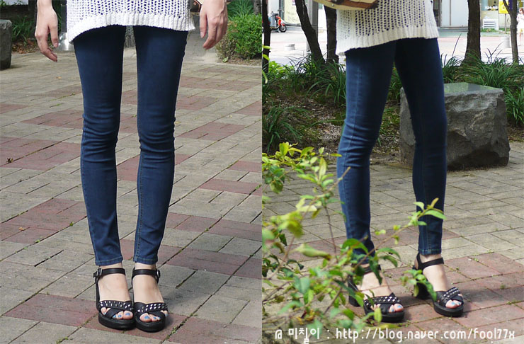 재질이 얇은 편이라서 여름에도 입을수 있는 스키니진인데요.. 물론 요즘같이 폭염날씨엔 반바지가 젤 이뿌겠지만,