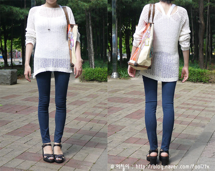 앞뒤 모습은 요렇게 거의 발목까지 쫙붙는 스타일입니다.. 그리고 그물니트 안에는 토끼망고나시를 입어주었구요^^