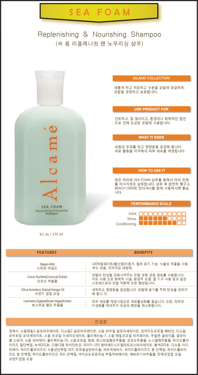 알카메이 : 씨 폼 리플레니슁 앤 노우리싱 샴푸 & 비취 크림 리플레니슁 앤 노우리싱 컨디셔너 각 210ml/ 각 34,000원 가격대는 좀 있는듯 하네요... |