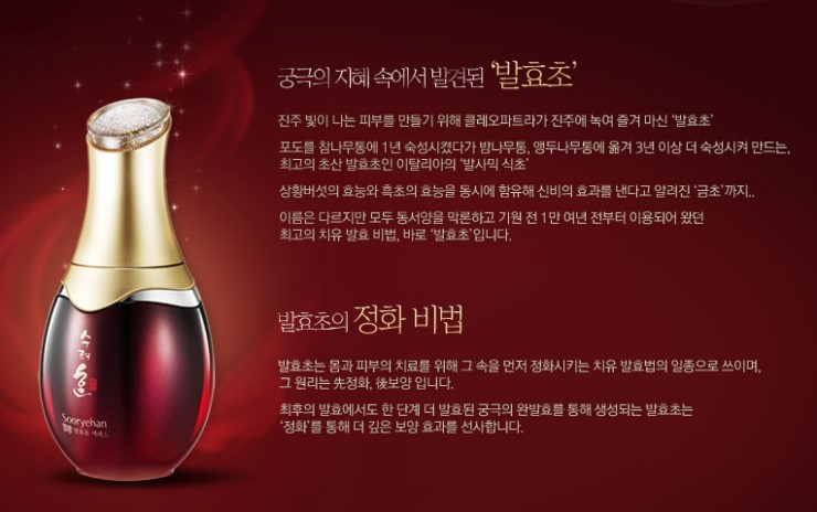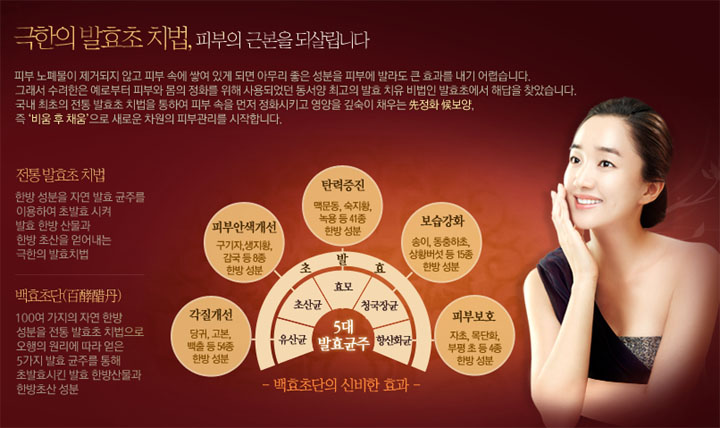 몸과 피부의 치료를 위해 먼저 정화 시키고 치유하는 발효법의 일종으로 정화를 통해 더 깊은 보양 효과를 선사한다고 합니다.