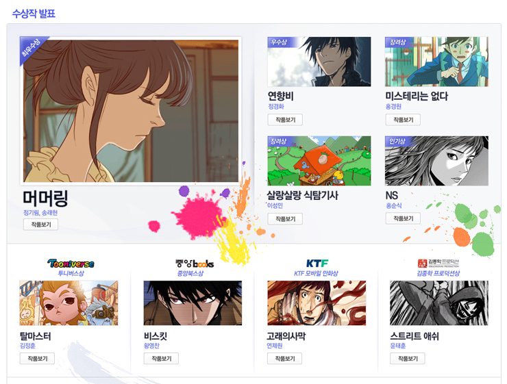 다음에서 진행한 것이라 알짜배기들이 모인 것이라 하겠지만 만화가의 위상이 나름 높아지고 있고, 성공적인 롤 모델도 나오고 있는 상황이니 웹툰으로도 얼마든지 행복하게 살 수 있다고 생각하는 젊은이들이 늘어나고 있어 저 같은 소비자의 입장에서는 행복할 따름입니다. 단지 이런 창작물들을 가지고 있는 창작자들이 몇년후에는 한국 만화나 애니메이션 시장에 염증을 느끼고 더 좋은 조건과 환경적으로 월등한 일본이란 나라에 유혹에 건너갈 수도 있다는 생각을 또 해보면 걱정이 되기도 하고 말이죠.