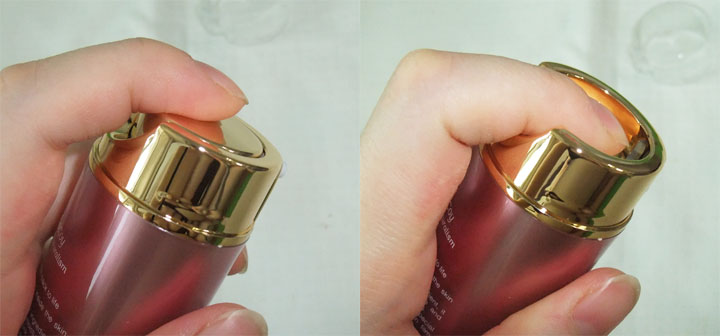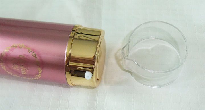 제품을 꺼내보았습니다. 요렇게 제품 역시 그라데이션 효과가 들어간 핑크빛으로 이루어진 디자인이구요.. 입구 부분은 골드빛으로 이루어져 더욱더 깔끔하면서 고급스러운 느낌을 주는 디자인 입니다. 뚜껑 부분은 투명 플라스틱 재질로 이루어져 있구요~