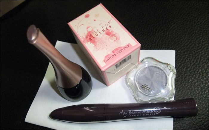 메이블라썸 마스카라(롱래쉬), 프리즘 스타 아이섀도우(실버 스노우), 스마일 팝 블러셔(로지 코랄), 컬러 에끌라 네일(네이비) 입니다