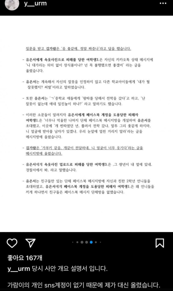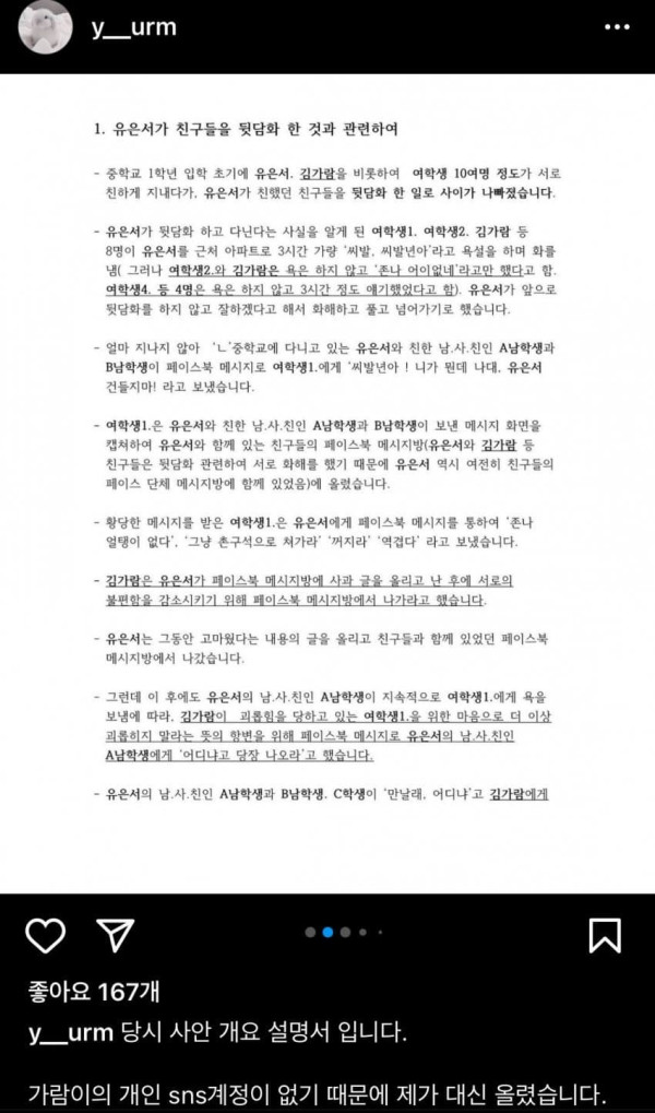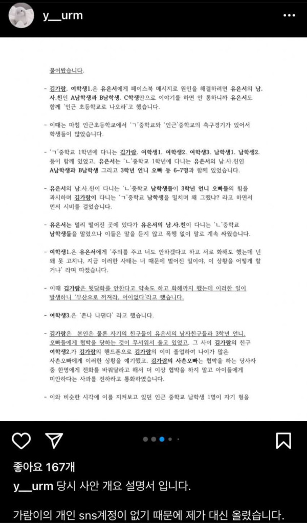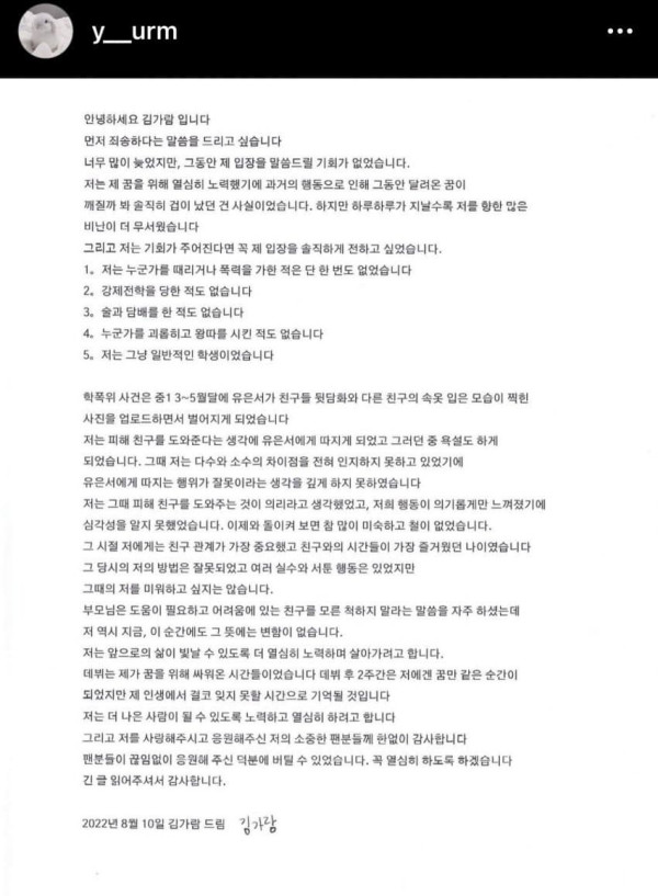 김가람 입장문 (feat.억울함) 주저리주저리 조회 0 원본보기 0 인기도 점수 0 0 요약 김가람 입장문 (feat.억울함) 요약 1. 때리거나 폭력 가한 적 정말 없음 2. 강제전학 당한 적도 없음 3. 술, 담배 한 적도 없음 4. 왕따 시킨 적도 없음 5. 일반적인 학생이었다 데뷔 후 2주간 정말 꿈같은 시간이었다 앞으로 더 나은 사람이 되도록 노력하겠다 그동안 응원해준 팬분들 감사했다 원본 페이지로 이동 추천 콘텐츠 포켓몬스터 개발진 야스쿠니 신사 참배 인증 0 아베, 제대로 된 답 가져오라고 겁박 0 “사실 아냐..검언유착 의심” 0 끈하나로 충분해요 0 정경미 성형 대성공 0 5살 조카 vs 학위 있는 페미 이모 0 관련 이미지 100 마프캠 존 유명한 베이글녀.gif 1323 박수진의 집중력 테스트 1940 국내도입이 시급한 예능 2022 이런 처제들이 있다고생각해봐 1652 AV 혼혈배우 1770 원피스 1053 감탄을 안할 수 가 없다. 1703