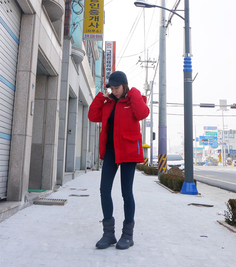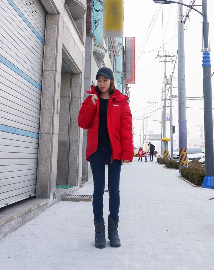 굳이 다른건 신경쓰지 않아도, 펠틱스 레드컬러의 패딩 자체가 코디를 확 살려주더라고요~